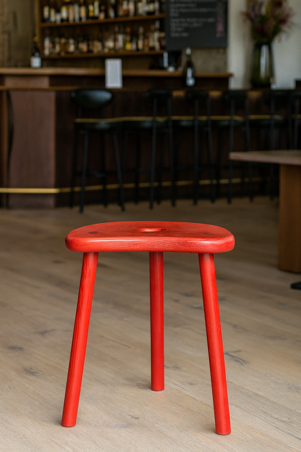 Ce tabouret est une version revisitée du vacher utilisé autrefois dans les fermes.